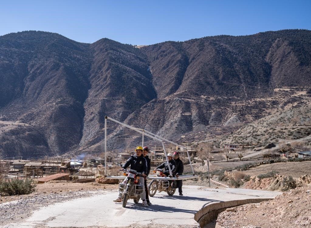修好啦,嘎瑪群美帶著摩托車隊(duì)馱著球門興沖沖回村