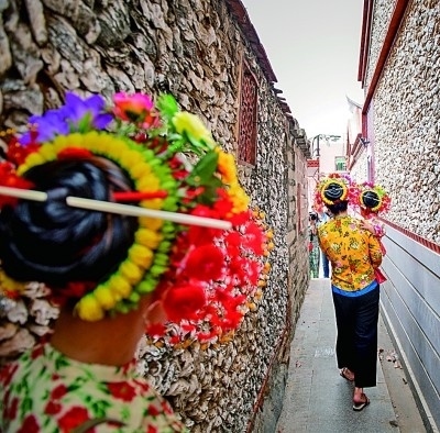 “今生戴花,來世漂亮”。在我國福建省泉州市的蟳埔村里,總能聽到這樣的話語。這座漁村,無論是巷子里拍照的姑娘,還是街邊滿頭銀發(fā)撬海蠣的阿婆,都盤發(fā)梳成圓髻,系上紅頭繩,插著滿頭花,成為村里靚麗的“風(fēng)景線”。五彩斑斕的簪花、象牙固定的發(fā)髻、蚵殼筑成的房屋……獨(dú)具特色的文化印記讓這座漁村迅速“出圈”,成為知名網(wǎng)紅地。