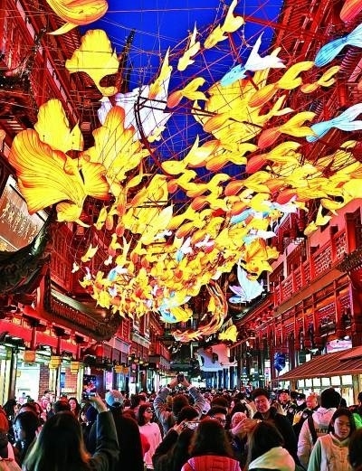 在上海豫園商城拍攝的“一夜魚(yú)龍舞”主題燈組與觀燈人潮。新華社發(fā)