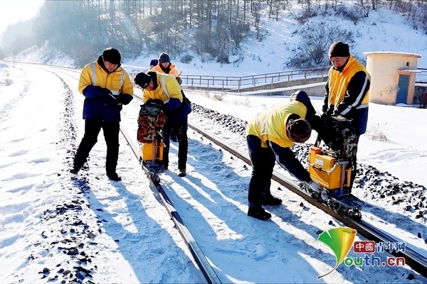兩臺(tái)超聲波鋼軌探傷儀,在身穿橙黃色工作服的探傷工的推行下,緩緩向線路遠(yuǎn)方走去。寒風(fēng)中,探傷工們從頭到腳的防寒裝備也為他們?cè)诙臼彝庾鳂I(yè)提供了保障。