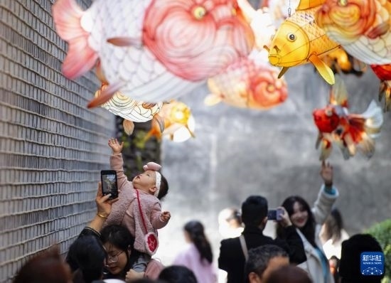 2月10日,市民游客在福州三坊七巷的小胡同里觀賞各式各樣的金魚花燈。