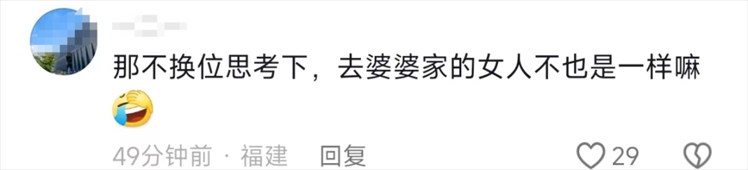 還有網(wǎng)友表示,這個時候,女婿更應該能過體諒媳婦在婆家過年的難處了,大家過年要互相體諒,換位思考。
