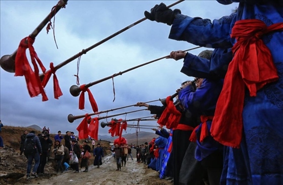 2016年春節(jié)前夕,貴州省惠水縣擺榜鄉(xiāng)石板村村民陳志良按照當?shù)鼗樗子怯涝疲吕山佑H隊伍長鳴長號迎娶新娘。