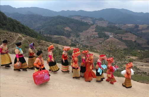 2017年2月21日,在四川省涼山彝族自治州德昌縣南山傈僳族鄉(xiāng)小南山村,新娘張小芳(右四)和送親隊伍帶著嫁妝向男方家走去。每年春節(jié)前后(農(nóng)歷臘月至次年二月)是當?shù)乩圩迦伺e行婚禮的季節(jié)。