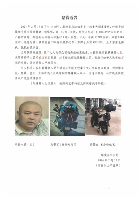 ·河南鄢陵縣發(fā)生重大刑案,警方懸賞5萬(wàn)緝捕嫌犯。