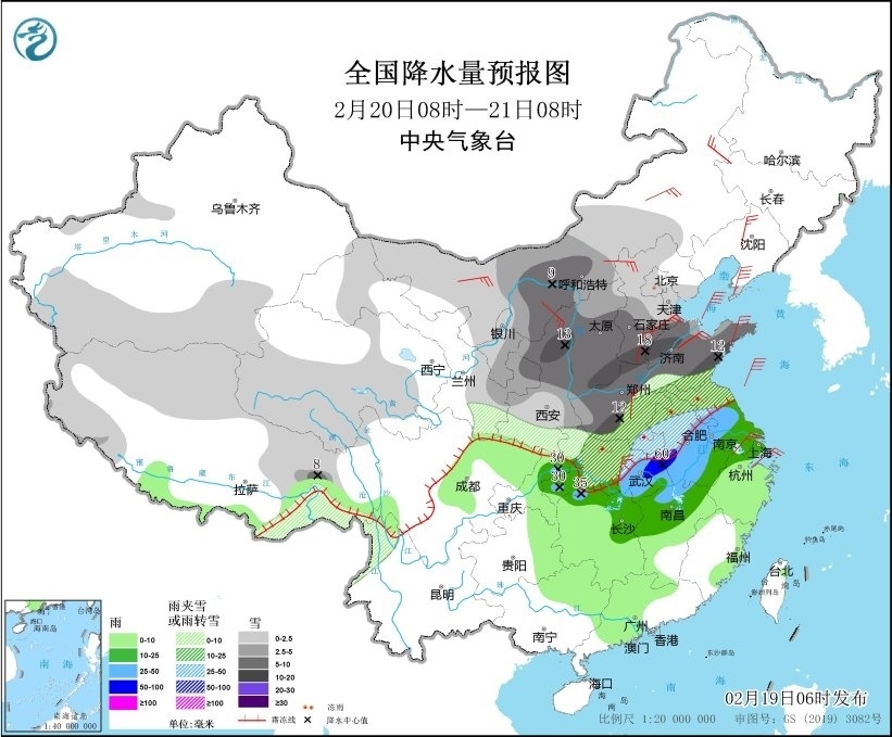 2月19日至22日,中東部地區(qū)將再現(xiàn)大范圍雨雪冰凍天氣。華北西部和南部、黃淮等地有大到暴雪,局地大暴雪;南方雨勢(shì)強(qiáng),并伴有雷暴、短時(shí)強(qiáng)降水和冰雹等強(qiáng)對(duì)流天氣。河南、安徽、湖北、湖南、貴州等地的部分地區(qū)將先后出現(xiàn)凍雨或冰粒。