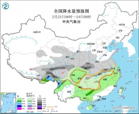 全國(guó)降水量預(yù)報(bào)圖(2月23日8時(shí)-24日8時(shí))