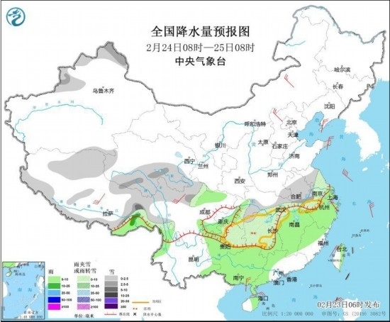 2月24日8時(shí)至25日8時(shí),新疆北疆西部和北部、西藏北部和東部、青海南部、川西高原北部、江漢東部、江淮、江南西部和北部、貴州東部等地的部分地區(qū)有小到中雪或雨夾雪,其中西藏東部等地的部分地區(qū)有大到暴雪。江南中東部、四川盆地、華南中西部、貴州西部、云南北部、西藏東南部等地有小到中雨。內(nèi)蒙古中部、河北北部、遼東半島、山東半島、浙江北部、西藏、川西高原北部、廣西南部沿海等地的部分地區(qū)有4~6級(jí)風(fēng)。黃海南部、臺(tái)灣海峽、南海東北部海域有5~7級(jí)、陣風(fēng)8級(jí)的偏北風(fēng)。