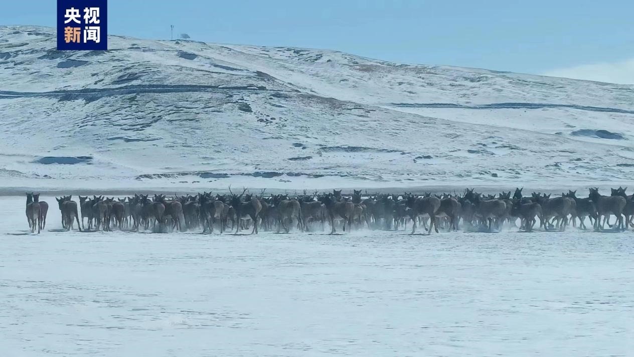 壯觀(guān)!超400只白唇鹿在黃河冰面上遷徙。