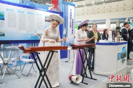 3月2日,廣西2024年春季人才交流大會(huì)在南寧國(guó)際會(huì)展中心舉行。圖為表演者在廣西防城港市招聘專區(qū)彈奏京族獨(dú)弦琴。陳冠言 攝