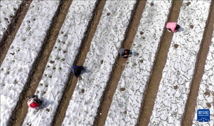 3月4日,村民在羅甸縣逢亭鎮(zhèn)粵港澳大灣區(qū)蔬菜保供基地勞作(無(wú)人機(jī)照片)。