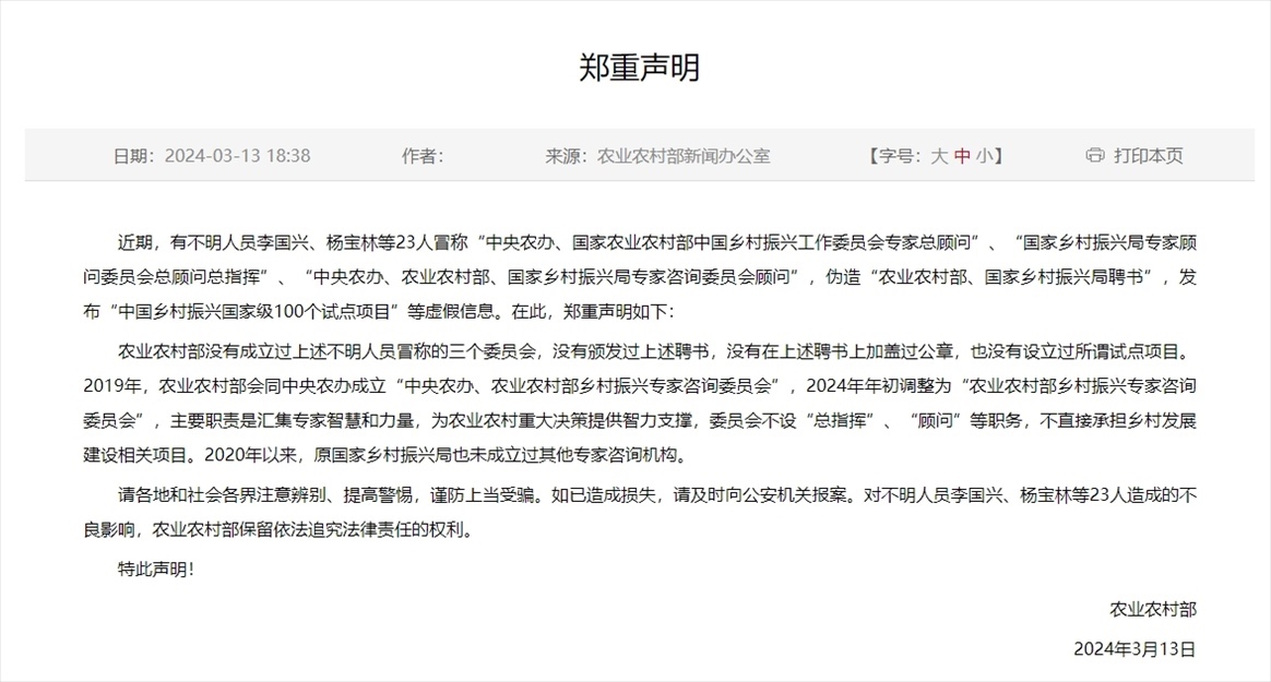 ·農(nóng)業(yè)農(nóng)村部鄭重聲明:沒有成立過不明人員冒稱的“中央農(nóng)辦、國家農(nóng)業(yè)農(nóng)村部中國鄉(xiāng)村振興工作委員會專家總顧問”、“國家鄉(xiāng)村振興局專家顧問委員會總顧問總指揮”、“中央農(nóng)辦、農(nóng)業(yè)農(nóng)村部、國家鄉(xiāng)村振興局專家咨詢委員會顧問”三個委員會,沒有頒發(fā)過上述聘書,沒有在上述聘書上加蓋過公章,也沒有設(shè)立過所謂試點項目。