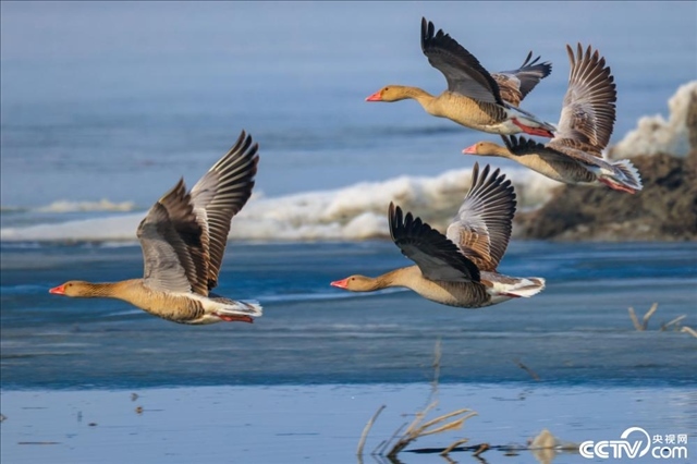 新疆巴州,隨著天氣轉(zhuǎn)暖,冰雪消融的博斯騰湖迎來大批候鳥。