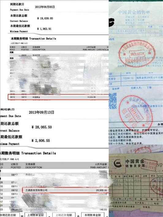 王鑫民:09年時(shí)候,他們跟順義那邊就有一個(gè)中國黃金店,就賣投資的黃金。我們想說買點(diǎn),將來自個(gè)老了以后能有一保證。他說,你要能寄存到這兒,還能給你點(diǎn)小禮品,我們想挺好的,你擱家多不安全,這么貴重的東西,我們就擱他那了,他給我們開單子。后來,順義這店搬到雙井去了,這是中國黃金的,而且商場(chǎng)更大,誰不都得放心。我們想跟他們也熟了,每年有點(diǎn)兒錢就買一點(diǎn)兒,還安全,還有點(diǎn)小獎(jiǎng)品,左一回買右一回買的,他店員都認(rèn)得我們了,挺熟的。他突然給我們打電話說:這出事了,你們趕緊過來。