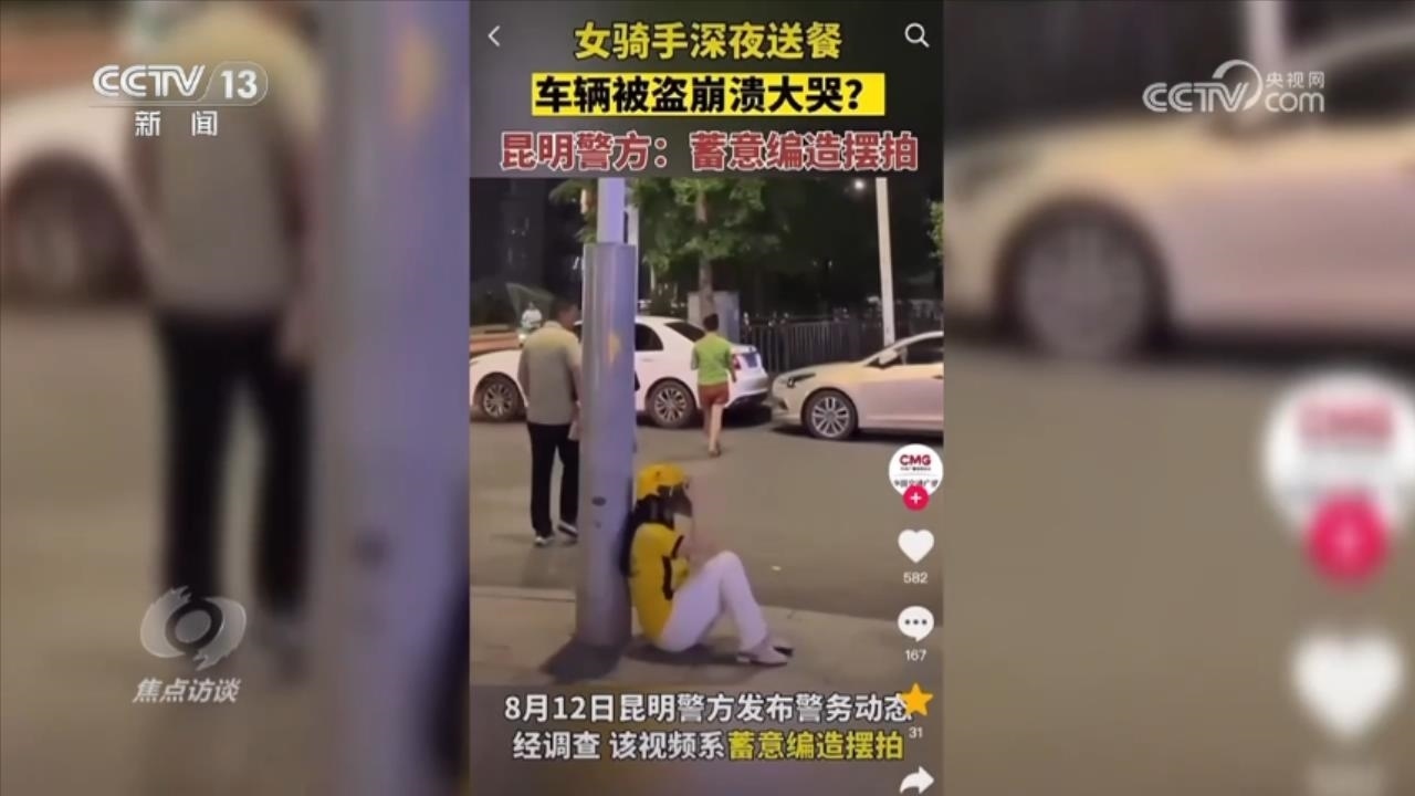 2023年8月3日,某網(wǎng)絡(luò)平臺發(fā)布了一個(gè)短視頻,除了哭泣聲,上面文字打的是“深夜,外賣姐姐送餐,下樓發(fā)現(xiàn)車被偷了”。然而,就是這樣一個(gè)時(shí)長僅10秒左右的視頻,當(dāng)晚瀏覽量已超6000萬次,并在多個(gè)平臺迅速傳播,進(jìn)入熱榜,隨即點(diǎn)贊、收藏量超過10萬次。同樣,這些也引起了警方的關(guān)注,經(jīng)調(diào)查核實(shí),該視頻為擺拍,發(fā)布者就是畫面中表演的女子,其丈夫在旁負(fù)責(zé)道具和指導(dǎo)。而他們當(dāng)時(shí)擺拍的全過程被大街上的戶外監(jiān)控記錄了下來。