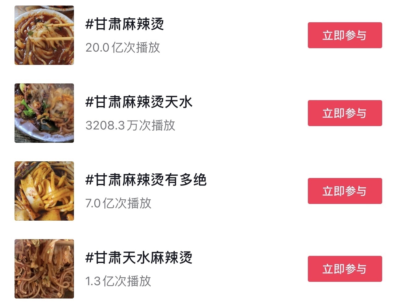 “這兩條視頻吸引了大量網(wǎng)民觀看、點(diǎn)贊、轉(zhuǎn)發(fā),之后陸續(xù)有網(wǎng)民發(fā)布相關(guān)視頻?!?月18日,甘肅省文化和旅游廳在回復(fù)網(wǎng)友建議中提到,3月份以來,“甘肅麻辣燙”話題迅速發(fā)酵,視頻內(nèi)容迅速增加,多次登上抖音、快手等短視頻平臺熱榜。截至3月16日18:00,各大短視頻平臺上“甘肅麻辣燙”相關(guān)話題累計(jì)播放量已超過32.6億次。