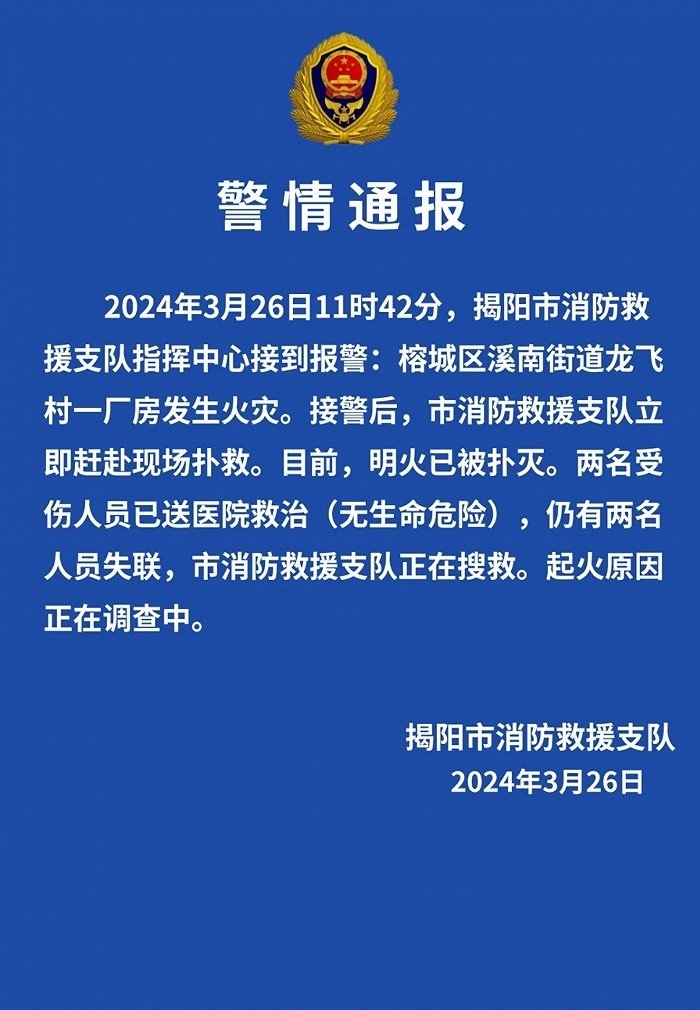 央視網(wǎng)消息:據(jù)“揭陽(yáng)發(fā)布”微信公眾號(hào)消息,揭陽(yáng)市消防救援支隊(duì)發(fā)布警情通報(bào),2024年3月26日11時(shí)42分,揭陽(yáng)市消防救援支隊(duì)指揮中心接到報(bào)警:榕城區(qū)溪南街道龍飛村一廠房發(fā)生火災(zāi)。接警后,市消防救援支隊(duì)立即趕赴現(xiàn)場(chǎng)撲救。目前,明火已被撲滅。兩名受傷人員已送醫(yī)院救治(無(wú)生命危險(xiǎn)),仍有兩名人員失聯(lián),市消防救援支隊(duì)正在搜救。起火原因正在調(diào)查中。