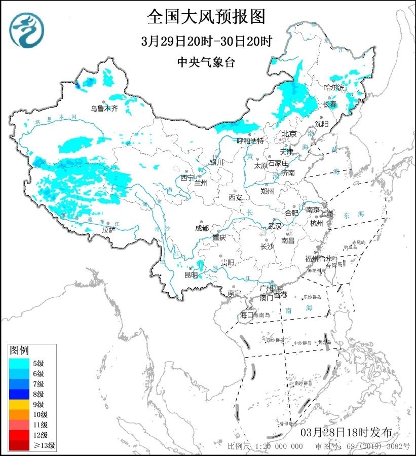 中央氣象臺3月28日18時(shí)繼續(xù)發(fā)布大風(fēng)藍(lán)色預(yù)警:
