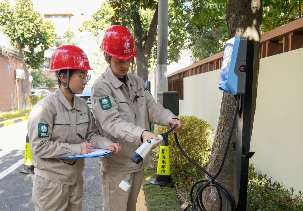 2023年11月29日,在上海市徐匯區(qū)田林十三村小區(qū)內,國網(wǎng)上海市南供電公司的工作人員在檢查充電樁運行情況。新華社記者 丁汀 攝