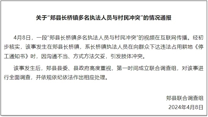 央視網(wǎng)消息:據(jù)“郟縣發(fā)布”公眾號消息,河南省平頂山市郟縣聯(lián)合調(diào)查組發(fā)布情況通報,4月8日,一段“郟縣長橋鎮(zhèn)多名執(zhí)法人員與村民沖突”的視頻在互聯(lián)網(wǎng)傳播。經(jīng)初步核實,該事發(fā)生在郟縣長橋鎮(zhèn),系長橋鎮(zhèn)執(zhí)法人員在向群眾下達違法占用耕地《停工通知書》時,因溝通不當、方式方法欠妥,引發(fā)肢體沖突。