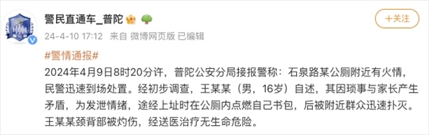 央視網(wǎng)消息:據(jù)@警民直通車_普陀 微博消息,4月9日8時20分許,上海普陀公安分局接報警稱:石泉路某公廁附近有火情,民警迅速到場處置。經(jīng)初步調(diào)查,王某某(男,16歲)自述,其因瑣事與家長產(chǎn)生矛盾,為發(fā)泄情緒,途經(jīng)上址時在公廁內(nèi)點燃自己書包,后被附近群眾迅速撲滅。王某某頸背部被灼傷,經(jīng)送醫(yī)治療無生命危險。