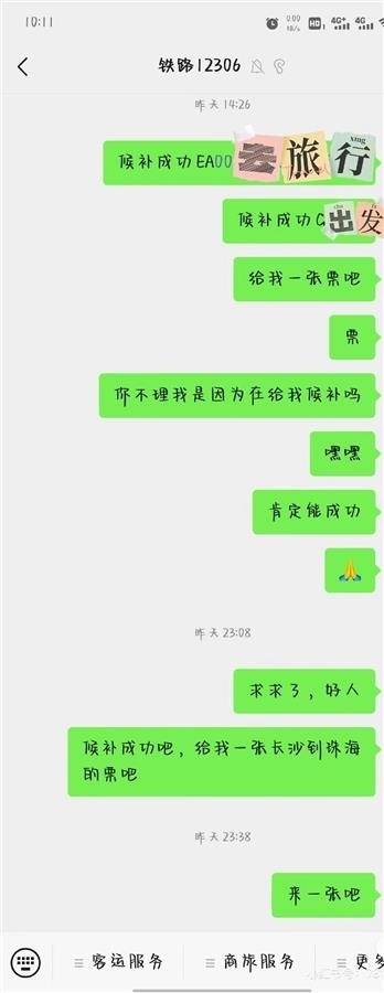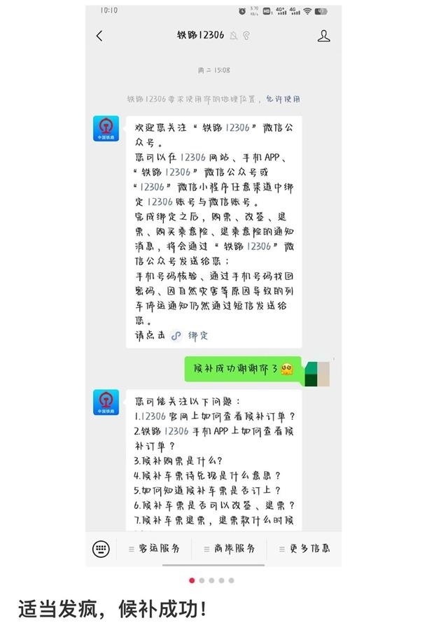 “你不理我是因?yàn)樵诮o我候補(bǔ)嗎”“親愛的我要票”……另一名網(wǎng)友也發(fā)帖稱,自己使用向12306微信公眾號(hào)“發(fā)瘋”的辦法,成功候補(bǔ)到了車票,其發(fā)布的網(wǎng)帖題為“適當(dāng)發(fā)瘋候補(bǔ)成功”。