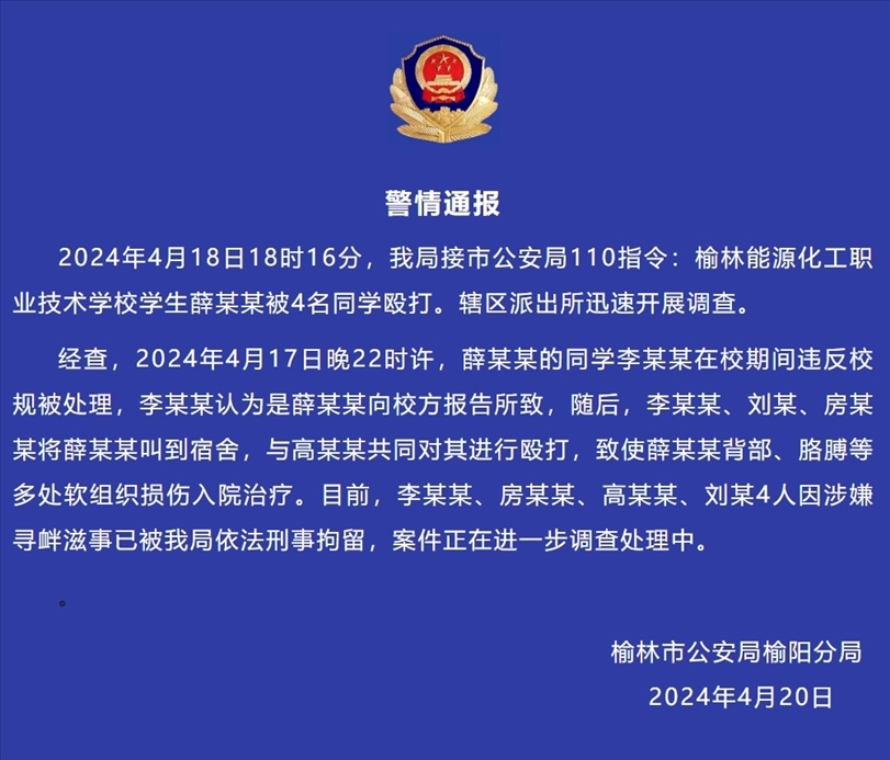 央視網(wǎng)消息:據(jù)陜西榆林公安消息,2024年4月18日18時(shí)16分,榆陽公安局接市公安局110指令:榆林能源化工職業(yè)技術(shù)學(xué)校學(xué)生薛某某被4名同學(xué)毆打。轄區(qū)派出所迅速開展調(diào)查。