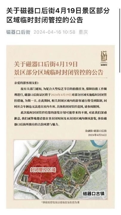 根據(jù)磁器口后街景區(qū)發(fā)布的公告,為配合大型綜藝節(jié)目的拍攝任務(wù),保障拍攝工作順利進行,磁器口后街景區(qū)于4月19日對部分區(qū)域?qū)嵤┡R時封閉管控措施,為期一天。該景區(qū)后續(xù)發(fā)布視頻也顯示,當(dāng)天確實為綜藝節(jié)目《奔跑吧》借地錄制。