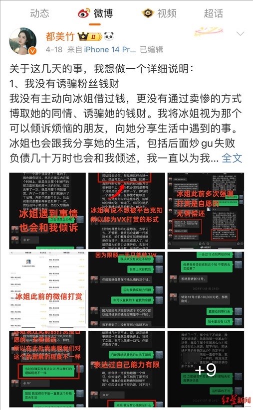 微博上,都美竹把上述朱姐說過的“無需你償還”“心甘情愿”、愿意供都美竹上大學(xué)的聊天截圖放在一起,表示朱姐“此前多次強(qiáng)調(diào),打賞是自愿的,無需償還”。