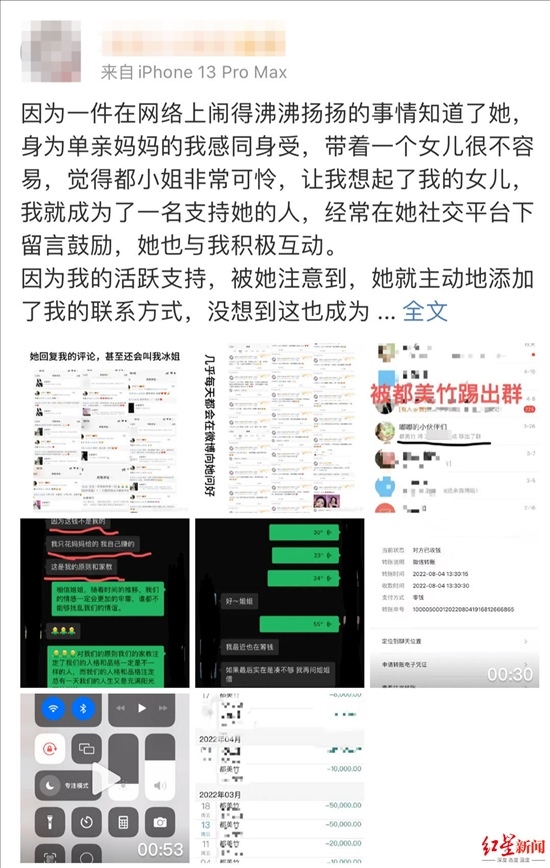 4月15日,都美竹粉絲朱姐發(fā)文稱,她先后給都美竹轉(zhuǎn)款近20萬元,現(xiàn)在認(rèn)為都美竹“賣慘”騙錢。她希望都美竹還錢,但對(duì)方只給她轉(zhuǎn)了3萬元。