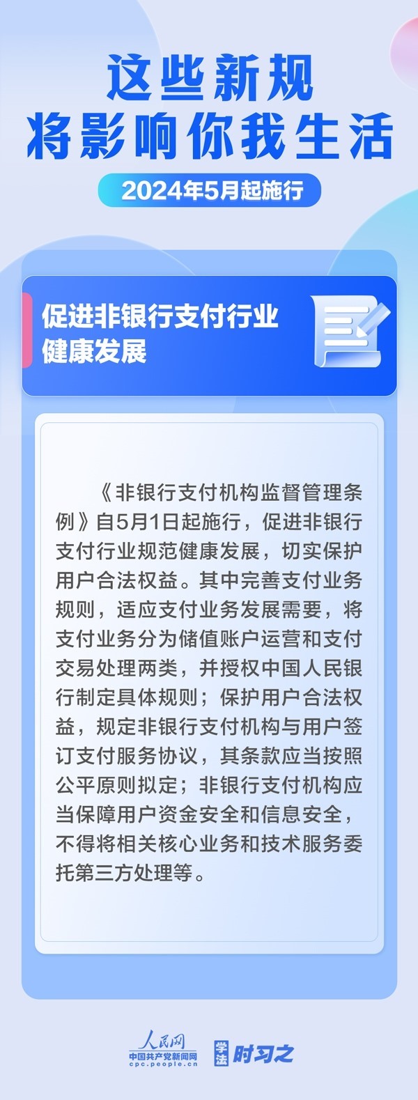 促進(jìn)非銀行支付行業(yè)健康發(fā)展;首次對(duì)社會(huì)組織名稱進(jìn)行統(tǒng)一規(guī)定;破除資格預(yù)審等招投標(biāo)領(lǐng)域交易壁壘……5月起,這些新規(guī)施行,將影響你我生活。