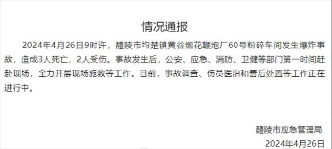 ·湖南醴陵市一煙花鞭炮廠車間發(fā)生爆炸事故,致3死2傷。