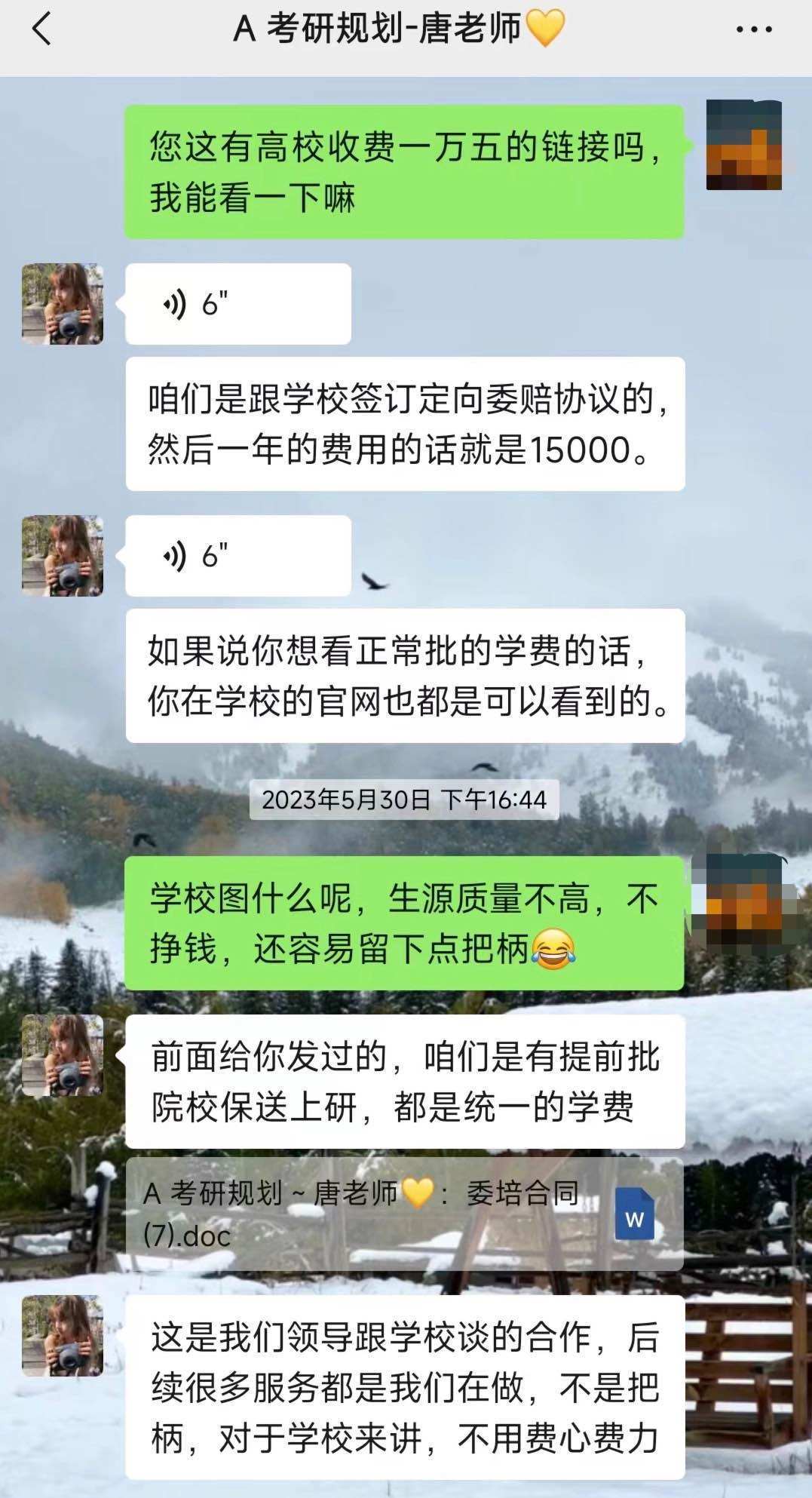 記者以學(xué)員的身份聯(lián)系了該機(jī)構(gòu),隨后有一名自稱“負(fù)責(zé)研究生報(bào)考的陳老師”添加了記者微信。對(duì)方稱,研才教育是國(guó)家指定的助學(xué)單位,配合全國(guó)院校進(jìn)行社會(huì)合作招生,“多所名??蛇x,材料審核通過(guò)后直接安排院校對(duì)接,可以確保同學(xué)上岸”。