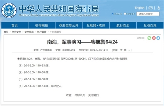 ·廣東海事局發(fā)布航行警告:南海部分海域進行射擊訓練,禁止駛?cè)搿?/p>