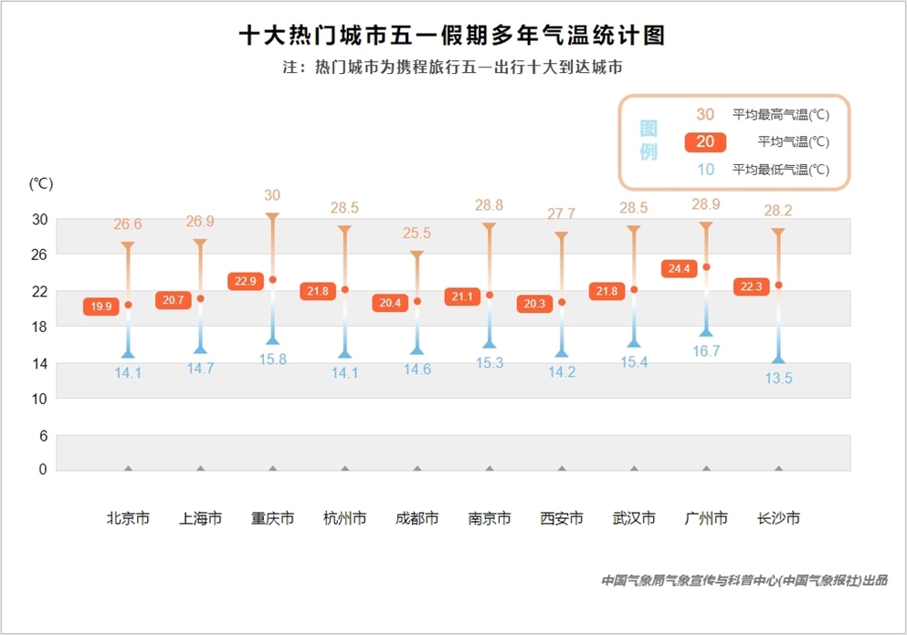 南北方熱門城市“五一”假期的氣溫差異并不大,都非常適宜出行,最高氣溫均在25℃以上。重慶是唯一一個(gè)在“五一”期間平均最高氣溫達(dá)到30℃的熱門城市,熱度與溫度都在高位,前往還需注意防暑降溫。