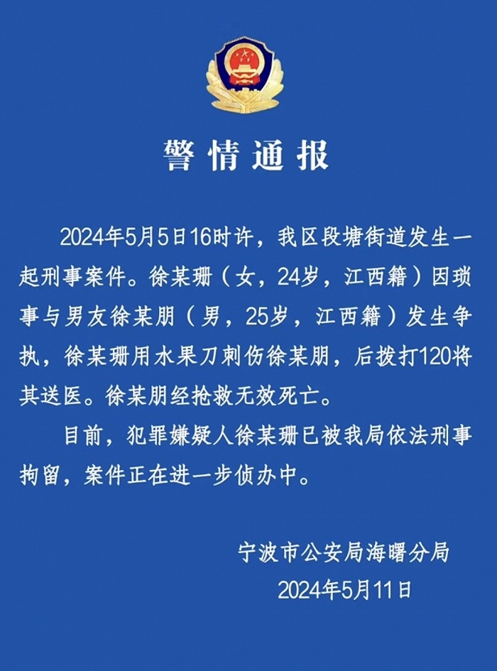 央視網消息:5月11日,寧波市公安局海曙分局發(fā)布警情通報,5月5日16時許,海曙區(qū)段塘街道發(fā)生一起刑事案件。徐某珊(女,24歲,江西籍)因瑣事與男友徐某朋(男,25歲,江西籍)發(fā)生爭執(zhí),徐某珊用水果刀刺傷徐某朋,后撥打120將其送醫(yī)。徐某朋經搶救無效死亡。目前,犯罪嫌疑人徐某珊已被海曙分局依法刑事拘留,案件正在進一步偵辦中。