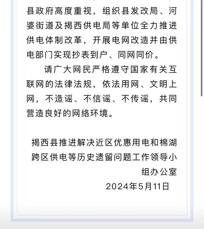 針對此事,“揭西發(fā)布”微信公眾號于5月12日發(fā)布了情況說明,表示對網(wǎng)上反映的“村民稱電費從3毛漲到6毛8交不起”的問題高度重視,并已立即開展調(diào)查。