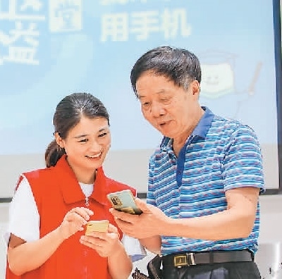 志愿者在福建省福州市鼓樓區(qū)安泰街道于山社區(qū)教老人使用智能手機。謝貴明攝(人民視覺)