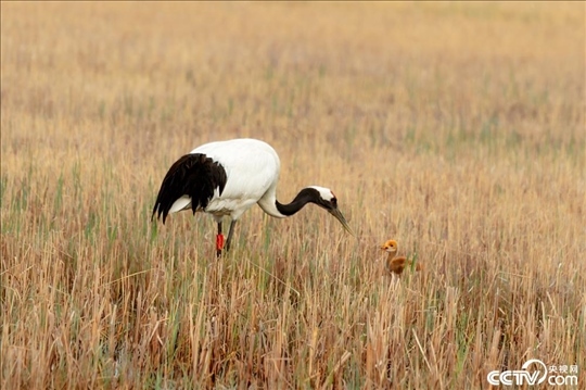 黑龍江省齊齊哈爾市扎龍國家自然保護(hù)區(qū),國家一級(jí)保護(hù)動(dòng)物野化的一對(duì)丹頂鶴夫妻成功孵化一個(gè)丹頂鶴寶寶,丹頂鶴夫妻蘆葦蕩里叼著食物喂小寶寶,丹頂鶴寶寶毛茸茸的非??蓯?。