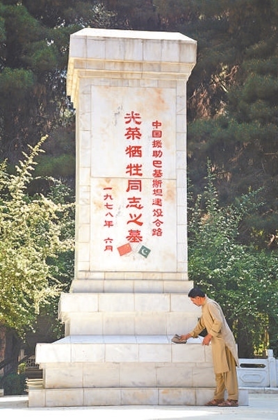 巴基斯坦北部城市吉爾吉特東郊的丹沃爾村有一座中國烈士陵園。1966年至1978年,中國援助巴基斯坦修建喀喇昆侖公路。12年間,數(shù)百名中國工程技術(shù)人員獻出了生命,其中88人安葬在此。從1978年起,艾哈邁德和父親在這里守陵,每天打掃陵園。圖為艾哈邁德在擦拭紀念碑。本報巴基斯坦分社 賽義德·邁赫迪攝
