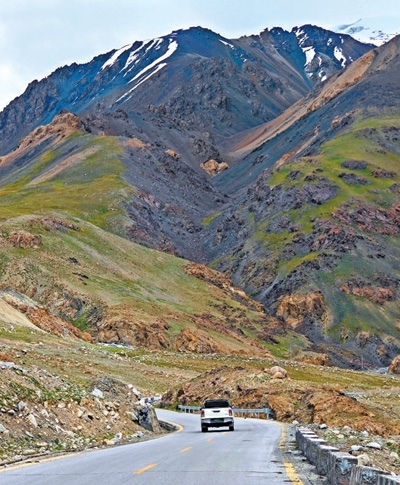 喀喇昆侖公路穿越高原山地地區(qū),大量路段區(qū)域海拔高、地質(zhì)條件復雜,修建難度大。圖為車輛在喀喇昆侖公路高原山地路段行駛。瓦卡斯·阿赫邁德攝