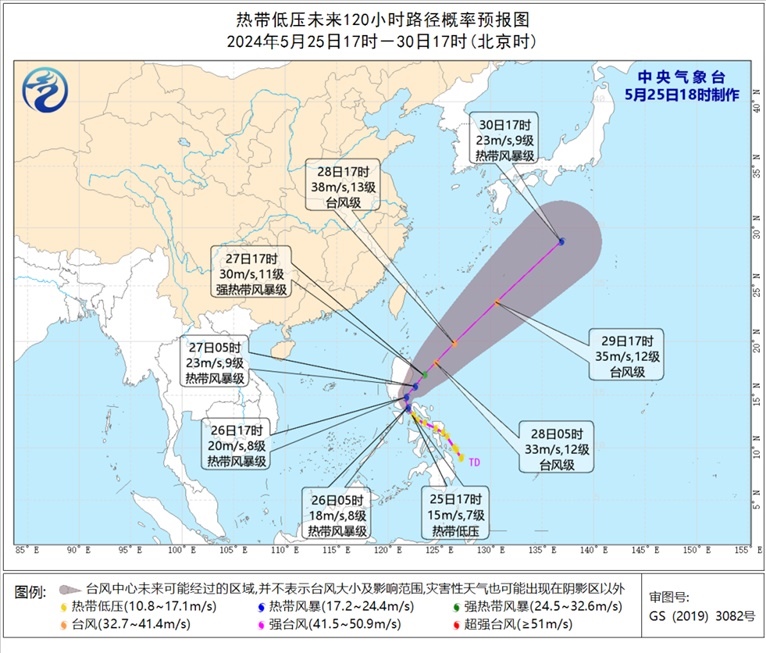 再看看菲律賓附近熱帶低壓,其中心今天下午5點鐘位于菲律賓馬尼拉東南方大約225公里的菲律賓群島中部,預計將于未來12小時內加強為今年第1號臺風,明后天將在菲律賓呂宋島東部海面逐漸轉向東北方向移動。