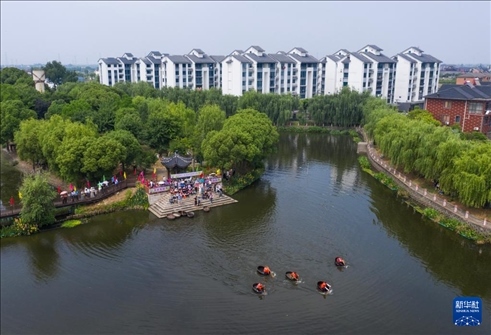 5月25日,村民們參加水鄉(xiāng)劃菱桶比賽。菱桶是河網(wǎng)密布的東林鎮(zhèn)百姓家中常見的一種傳統(tǒng)水上勞動工具,村民在捕魚、采菱、采荷時都要用到(無人機照片)。