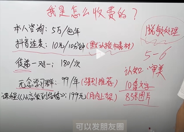 此外,不少婚戀軍師都公開(kāi)了聯(lián)系方式,通過(guò)提供一對(duì)一指導(dǎo)、付費(fèi)視頻、情感課程、收徒、經(jīng)營(yíng)朋友圈教學(xué)等形式斂金,且價(jià)格不菲。