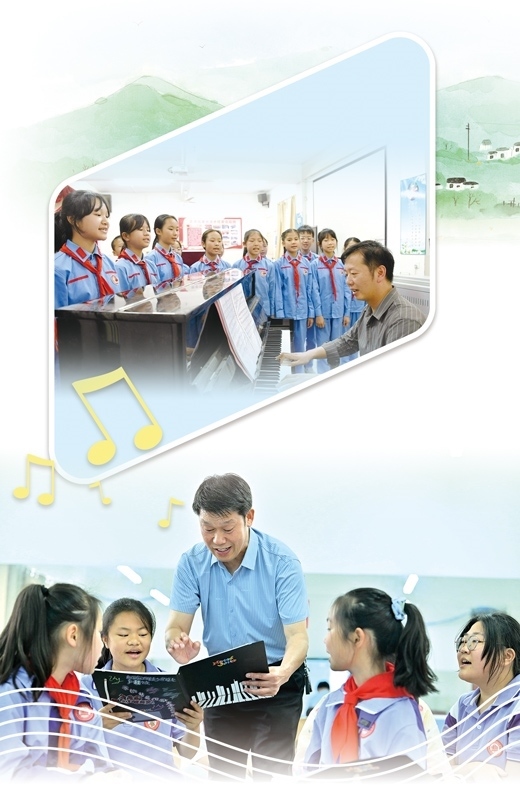 講臺(tái)上,隨著廖光新的雙手向前一打開,學(xué)生們齊刷刷地唱了起來?!敖裉焯鞖夂茫フ腋赂拢ㄍ馄牛﹪D……”稚嫩而清脆的聲音瞬間充滿整個(gè)教室,透過窗戶傳向遠(yuǎn)處的大山。
