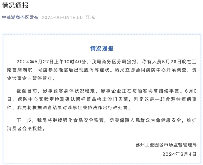 央視網(wǎng)消息:據(jù)蘇州工業(yè)園區(qū)市場監(jiān)督管理局通報,5月27日上午10時40分,商務區(qū)分局接報,稱有人員5月26日晚在江南首席湖濱一號店參加晚宴后出現(xiàn)腹瀉等癥狀。該局立即會同疾防中心開展調查,責令涉事企業(yè)暫停營業(yè)。