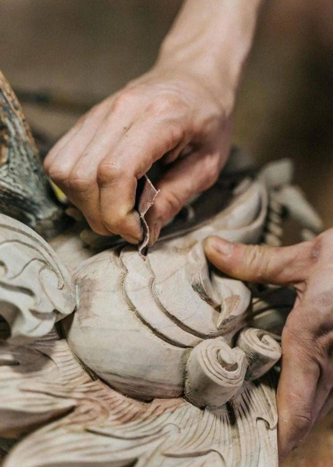 張偉潮身上的傷也沒斷過?!疤焯旄洞蚪坏?,有時(shí)候傷口剛縫了線,回到家一干活,刀口又開了”,手臂上、手背上遍布的傷疤,見證了每一個(gè)龍頭的誕生?!懊肯乱坏?,我都已經(jīng)想好了后面的第二步、第三步”,龍頭雕刻極為考究,從選料、切割,到粗雕、精雕,再到打磨、拋光、裱漆,十幾道繁瑣工序,全靠師傅的眼光和手藝。機(jī)械化、流水線,做不出龍頭嗎?在數(shù)不清的日夜里,光影斑駁間,張偉潮拿著父輩傳下的一刀一錘,一下一下,慢慢開鑿,給出自己的答案。