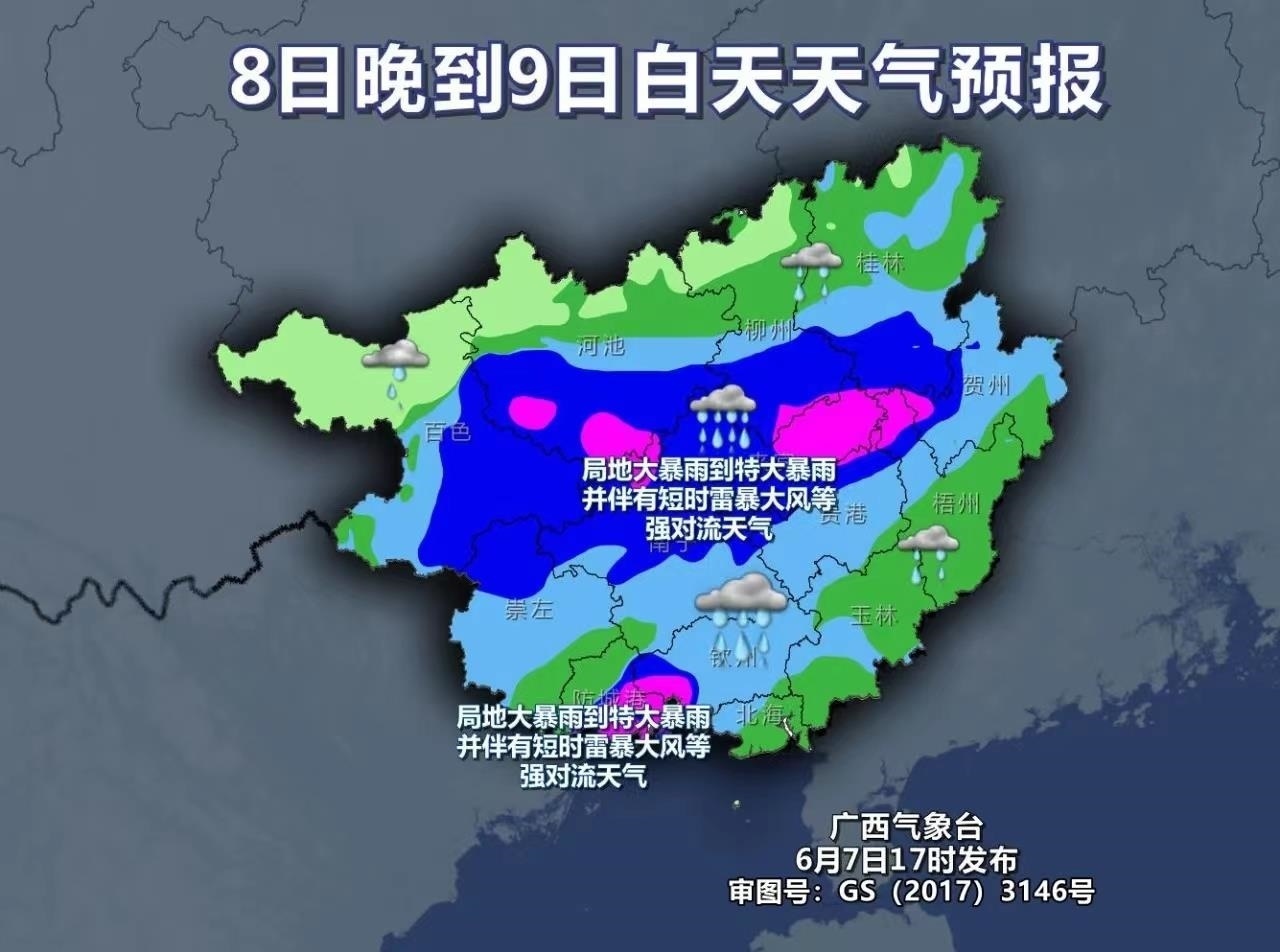 8日晚上到9日白天,雨勢升級,并進(jìn)入此輪降雨的最強階段,強降雨的范圍也將進(jìn)一步擴大,廣西全區(qū)有大雨到暴雨,局地有大暴雨到特大暴雨,并伴有短時雷暴大風(fēng)等強對流天氣。