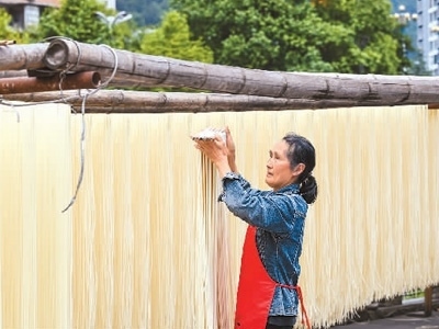 在重慶市酉陽土家族苗族自治縣桃花源街道河濱掛面加工作坊,村民正在晾曬傳統(tǒng)手工掛面。邱洪斌攝(人民視覺)