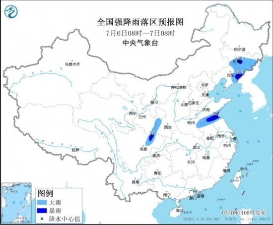 7月6日08時(shí)至7日08時(shí),內(nèi)蒙古東南部、東北地區(qū)中東部和西部、西藏北部和東南部、青海南部、西北地區(qū)東北部、黃淮東部和西部、江淮東部和西部、四川盆地西北部、云南西南部等地部分地區(qū)有中到大雨,其中,吉林中東部、遼寧東部、山東南部、江蘇北部、四川盆地西北部等地部分地區(qū)有暴雨(50~90毫米)。遼寧中部、西藏西部等地部分地區(qū)有4~6級(jí)風(fēng)。